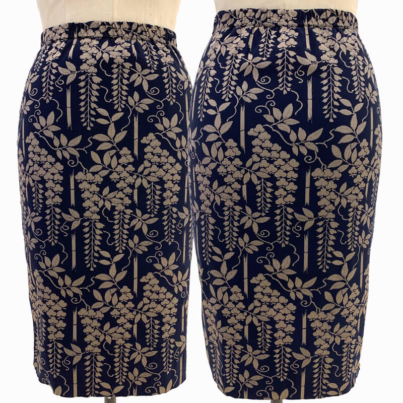 The design for the stretch pencil skirt was a direct result a stretch jacquard fabric purchased from Cloth House over 20 years ago. The gorgeous oyster coloured wisteria on a navy base was irresistible. The stretch runs down the length or warp of the fabric but the wisteria jacquard design lends itself to the fabric being turned and worn in the other direction resulting in the stretch going across the body. There is at least 18% Elastane in the fabric construction, so I knew it would retain its shape and not 'seat'.