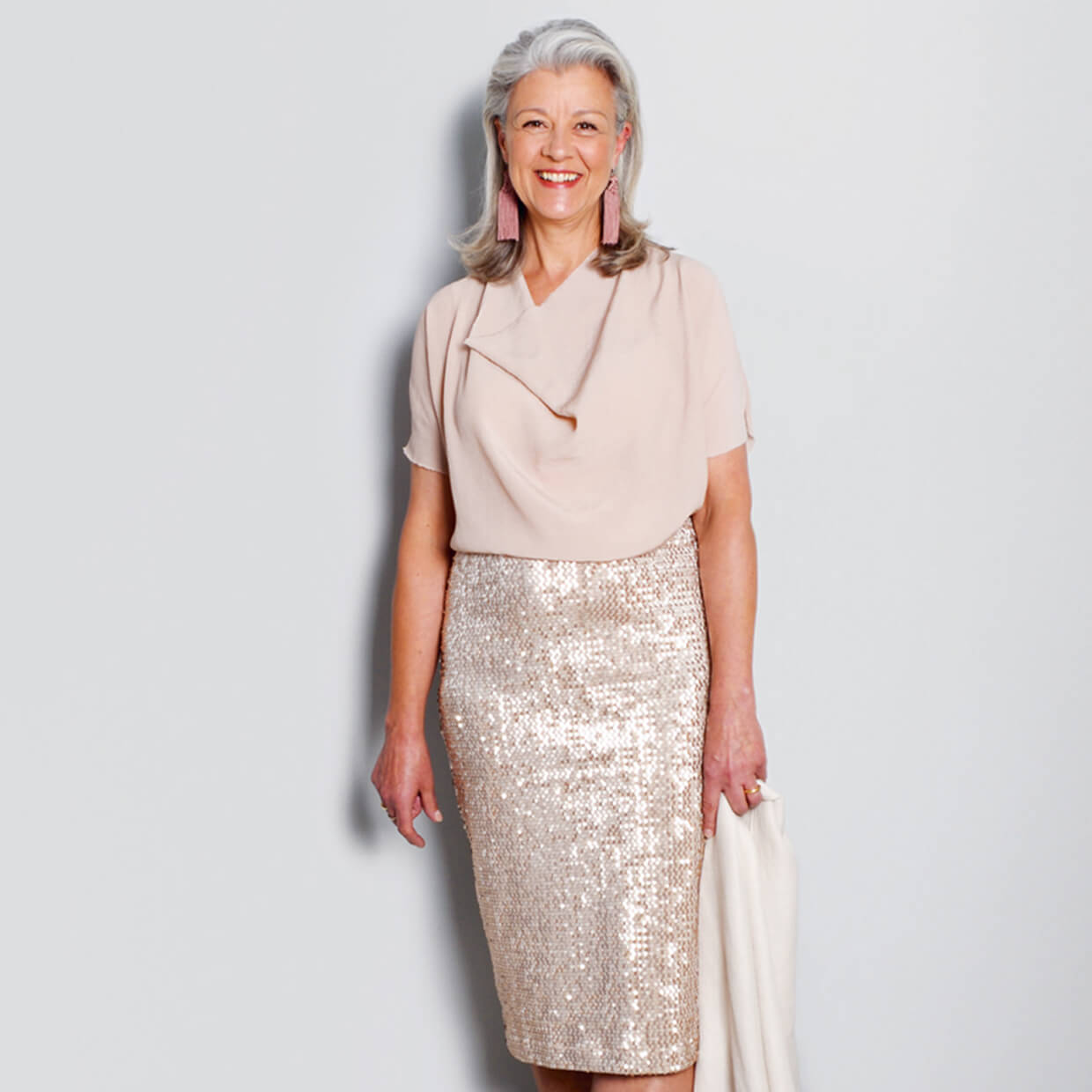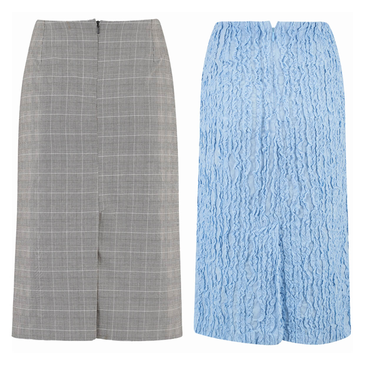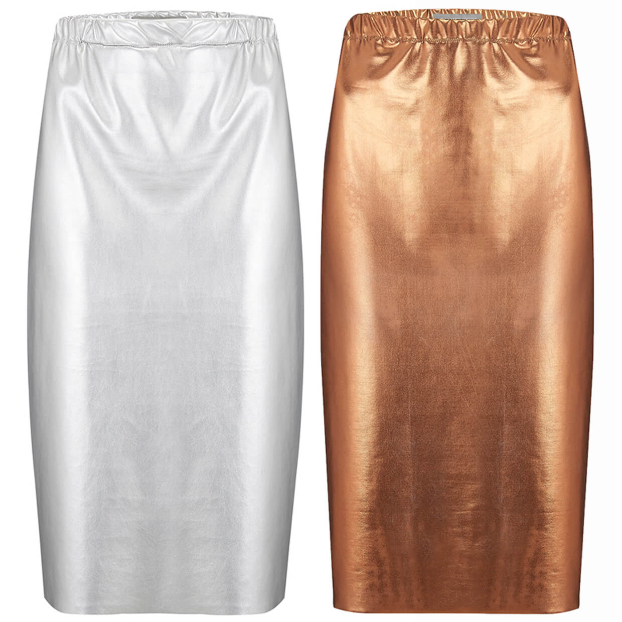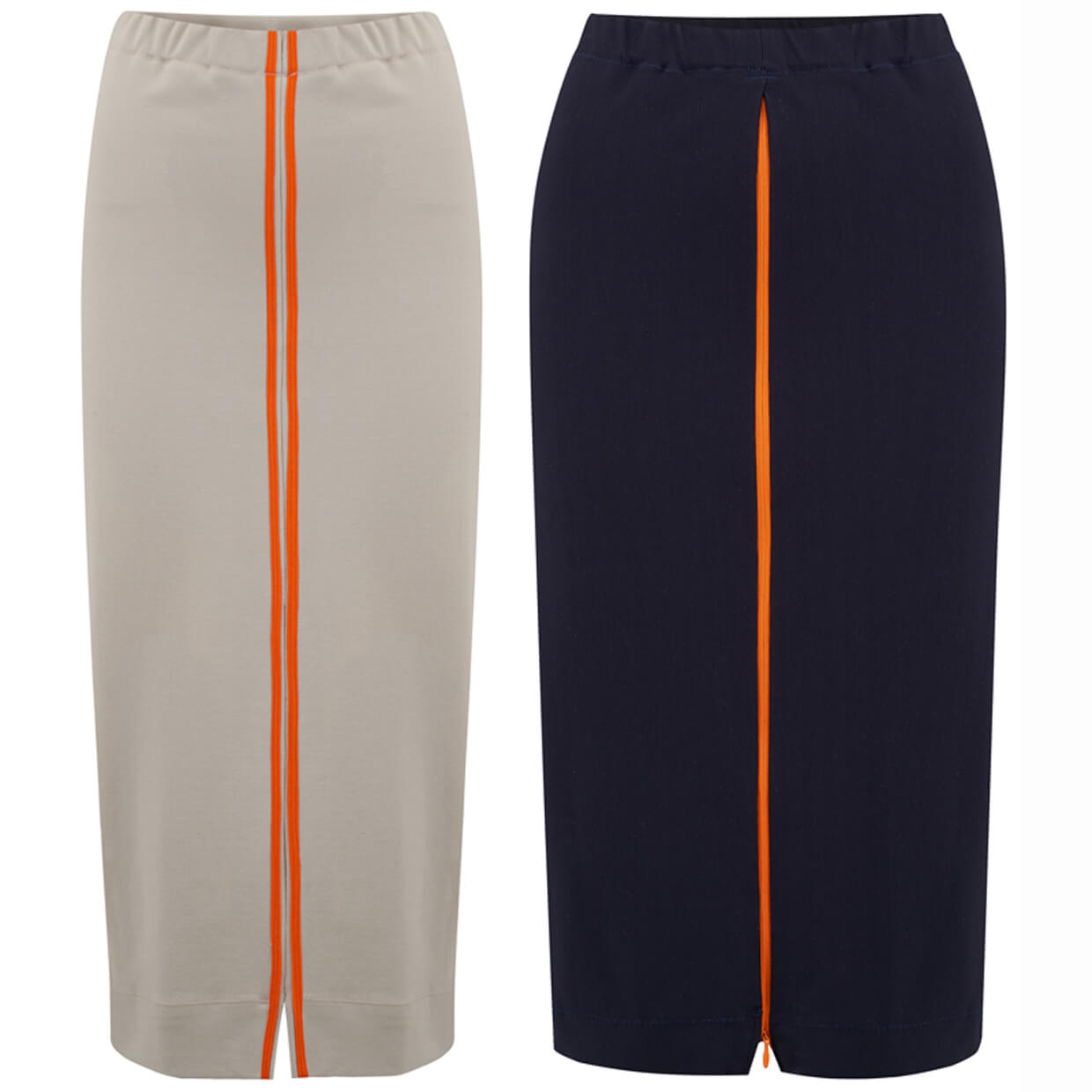 The metallic pencil skirts pictured are made from PU, the metallic surface is bonded to a jersey base. This fabric has enough stretch to work as the stretch version. The stone and navy, sports-inspired, stretch skirts are made in 'four-way' stretch with a centre front seam added for detail. On the stone one either side of the seam is trimmed with contrasting orange tape. On the navy skirt a nylon zip is inserted from below the waistband.