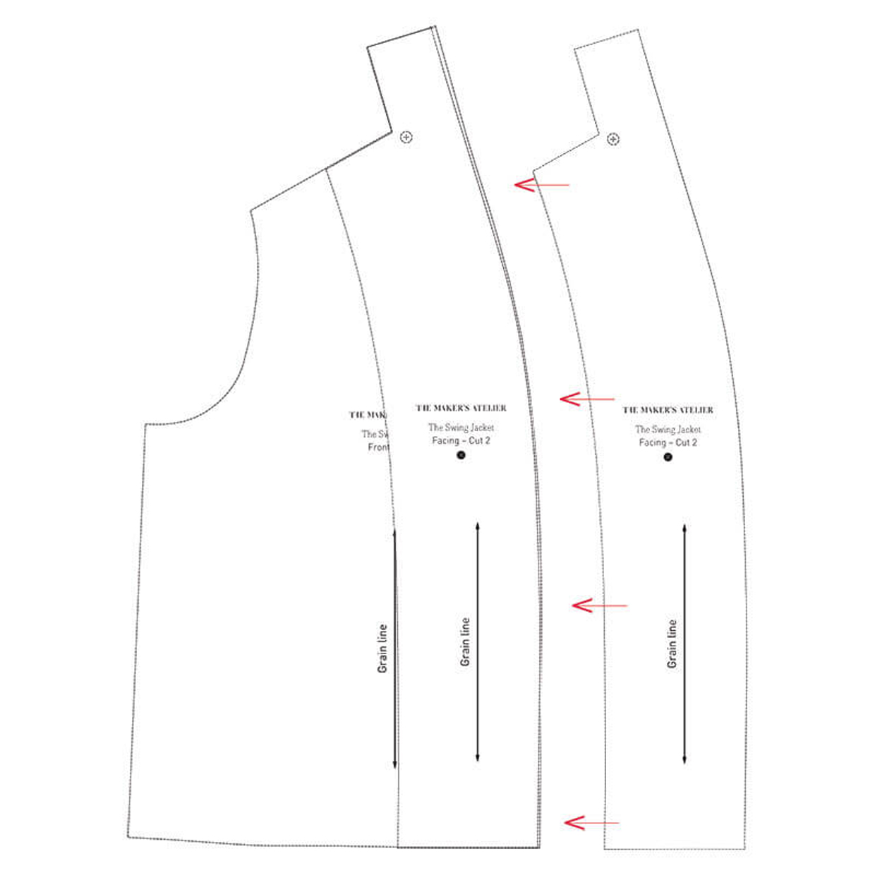 To Make - Cut out your main fabric as you would for the original unlined Swing Jacket. For the lining cut out 2 x new front pieces, 2 x original sleeves and 1 x original back. Make up the jacket out as shown in steps 1-3. Make up the lining by stitching the fronts to the back at the shoulder seam. Take the two facing pieces in the outer fabric and stitch together as shown in Step 4a from the instruction sheet.
