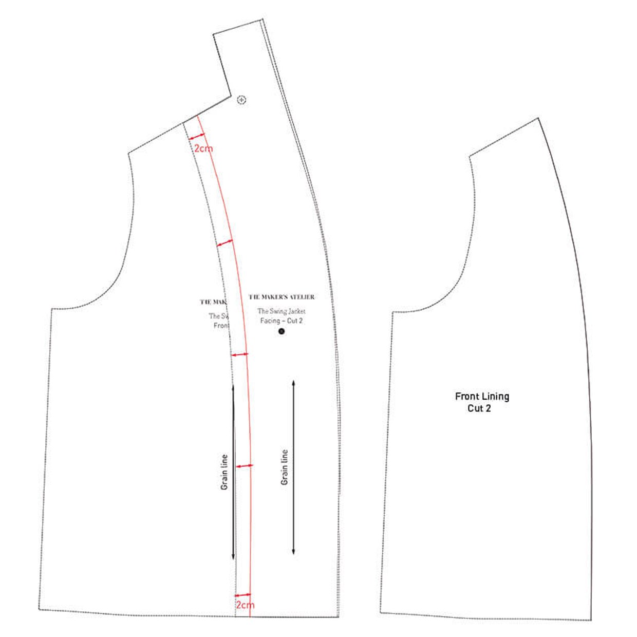 As the weather cools down and we head to the party season why not add a lining to your Swing Jacket? Here's how to do it......... First you need to create a simple lining pattern. From your Swing Jacket pattern take the jacket front piece and trace it off. Lay the facing piece over it and draw the facing edge line on to your new pattern piece.Remove the facing piece and then draw another line 2cm from the facing edge line. This will become the front lining piece. For the lining sleeves fold back your sleeve pattern by 4cm.