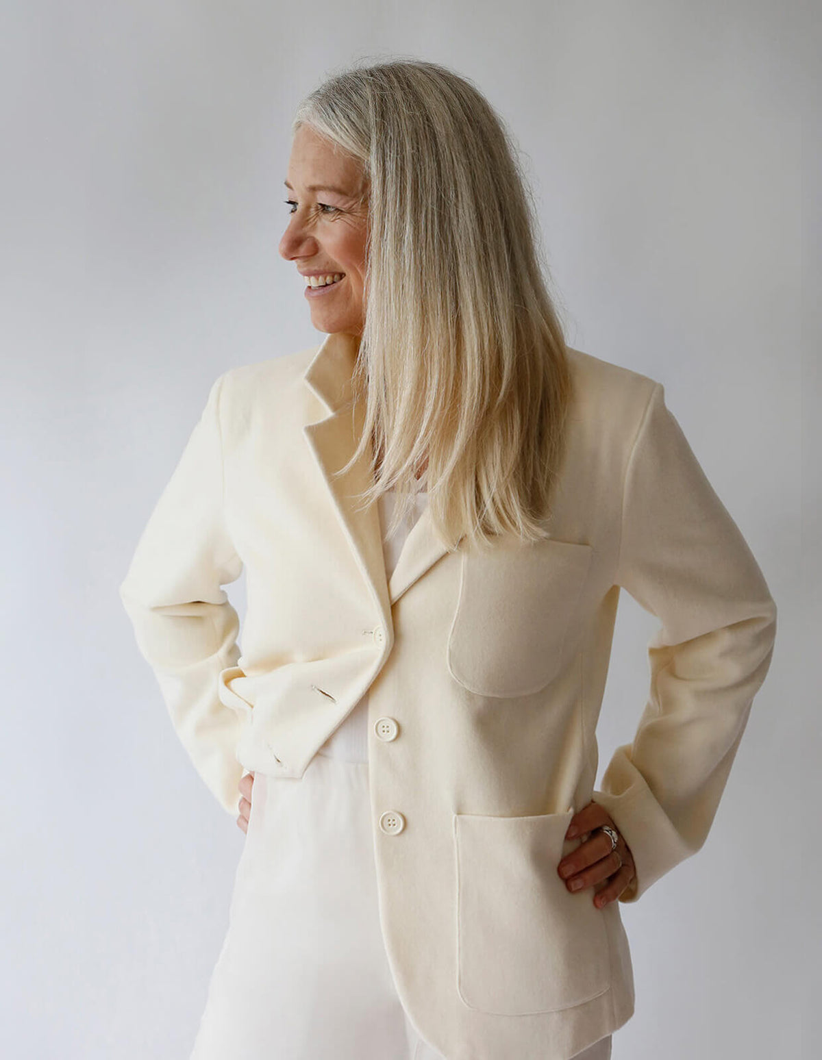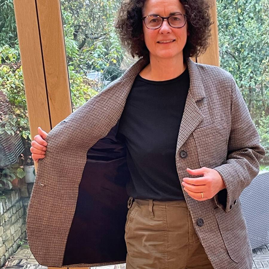 Inspired by a classic man's blazer. This style can be lined or unlined, there are instructions and pattern pieces for both. The sleeve has a faux placket with button detail.