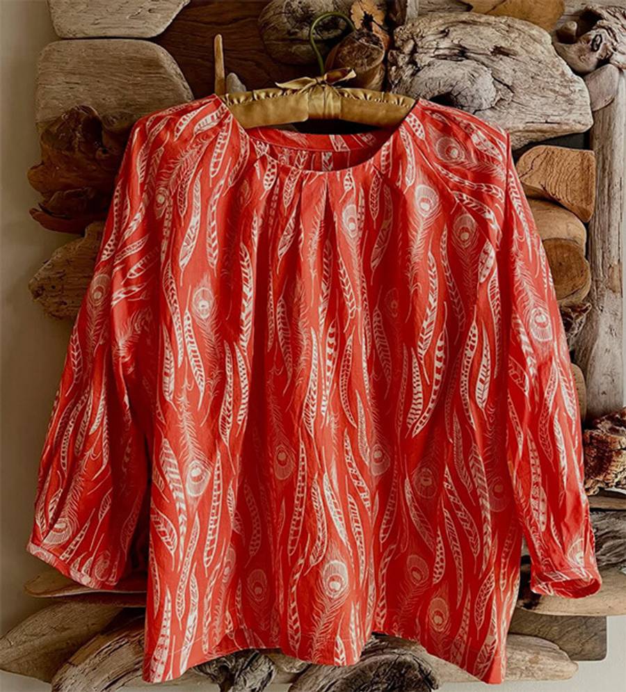 A pretty pull-on blouse with pinch pleats at the neck and cuff. Choose from three sleeve lengths: short, 3/4 and long sleeve.
