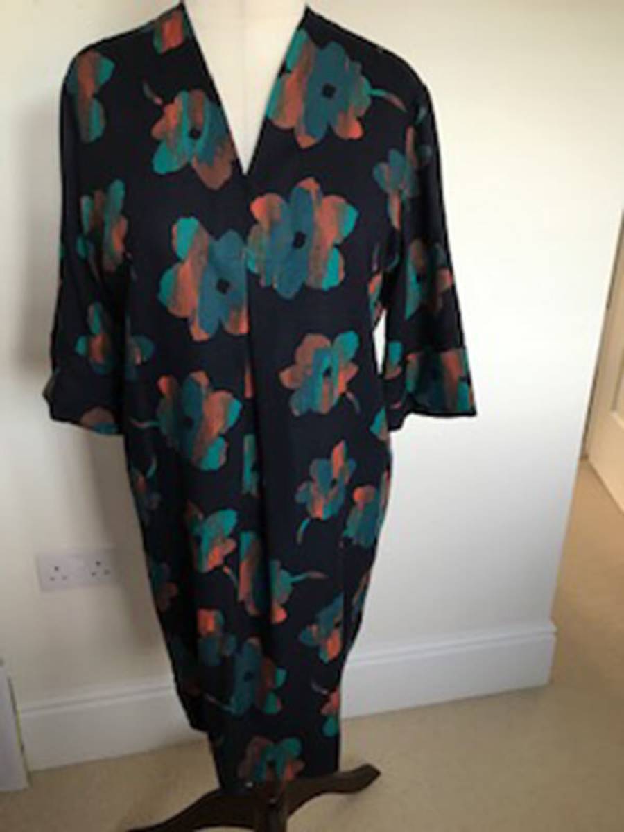 I was very tempted by this pattern as I saw a made up one (Facebook?) and it looked lovely. It did not disappoint. I bought the pdf and got it printed as there were no paper versions available and I hate sticking bits of paper together! I made size small, going from my upper bust measurement (34 ins) and my hip measurement of 37ins. My bust is nearer 37 ins but I have narrow shoulders and I could see that there was ample room for my bust in a size S. I shortened it by 3 inches as I am only 5 foot 3. I used a medium weight cotton/viscose fabric that I had in my stash, think it was from Seasalt. I managed to get it out of 1.8m of 140W fabric, slightly less than the 2m recommended, probably due to shortening the pattern and not putting pockets in. I really don't like pockets as I find they often ruin the line of a garment, particularly if it is a drapey fabric. I know some people will think that weird but I would not put anything in a pocket if I inserted one anyway. I don't like lumps and bumps all over the place! I did interface the inside of the V neck as was suggested (I made a quick pattern piece using the front bodice and piece of tissue). Also the back neck facing as directed, I felt my fabric needed it. First of all, I overlocked the side seams, shoulder seams, sleeve side seams, V neck and back neck (once interfaced) to stop fraying. The seams could then be pressed open when the seam was stitched. It was a dream to sew. Instructions were great and it came together well. It needs accuracy for the pleats at the front and back - I am a fan of tailor tacks! The only fiddly bit I found was the back neck facing which has to be sewn very precisely to work. Take your time and it will be OK. I overlocked the sleeve and armscye after I had inserted the sleeve. I was very pleased with the final result. It fits like a dream is very comfortable and looks very professional; it gets lots of compliments. I wore it at Xmas with a lightweight silky polo neck under it for warmth and will wear it in the spring/summer without. Very versatile then. I will probably make another one in linen.